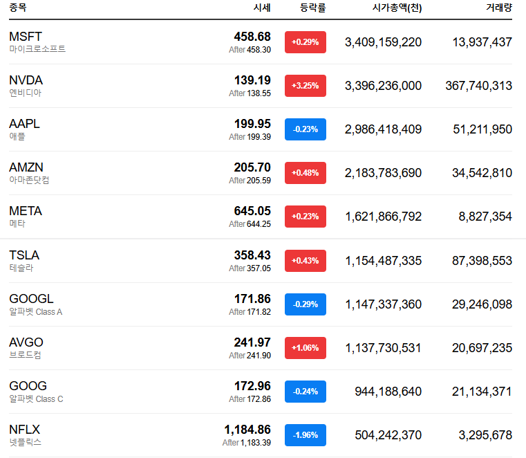 - 아리스타 네트웍(-6.92%)은 엔비디아가 네트워킹 장비에 대한 신규 고객으로 메타와 구글을 확보했다고 공개하자 크게 하락.