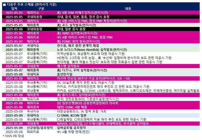 - FOMC: 5/7 수. 금리는 90% 이상의 확률로 동결 전망.