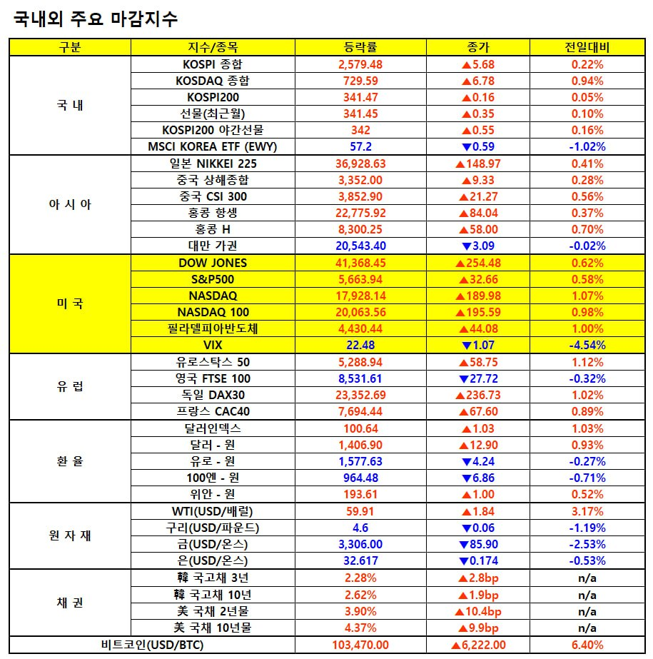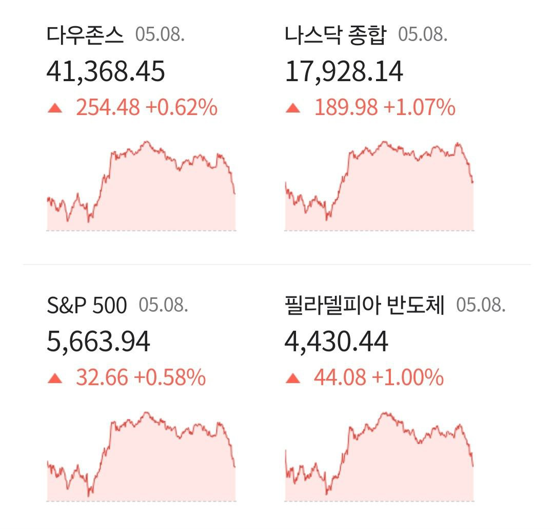 - 미국과 영국이 개괄적으로 관세 협상을 마무리하며 앞으로 협상에 대한 기대감이 크게 작용한 걸로 보이며 뉴욕 3대 지수 일제히 상승 마감