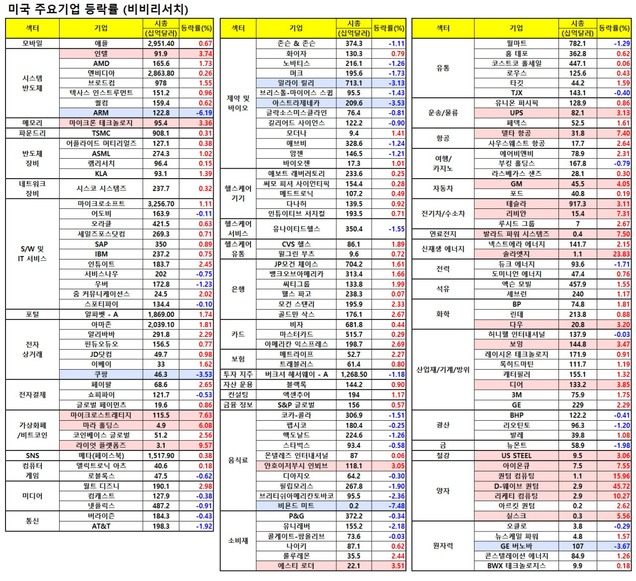 - 월마트(-1.42%), P&G(-0.40%)등 필수 소비재와 유틸리티, 리츠금융 회사들은 위험자산 선호심리가 높아지자 하락.