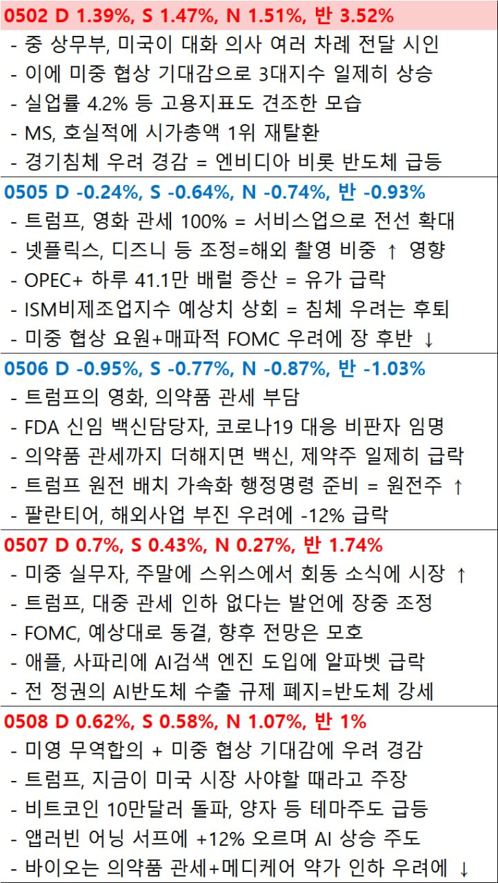 - 05/09 미 증시, 미-영 무역협상 타결 및 주말 미-중 협상 기대 반영하며 상승