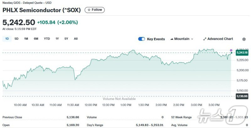 - PHLX 반도체 ▲ 5,242.50 (2.1%)