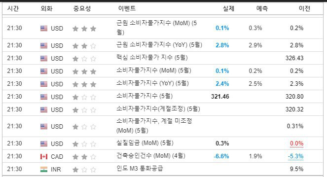 - 미국 5월 소비자 물가지수가 전월 대비 0.22%에서 0.08%로 둔화. 근원 소비자 물가지수는 0.3% 상승 전망과 달리 0.13%로 둔화.