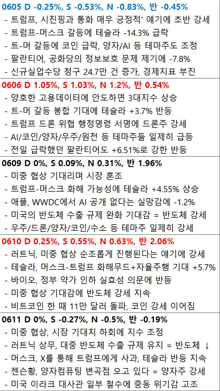 - [미·중 무역 합의와 물가 상승 둔화, 멕시코 협상 순항, EU협상은 난항 마지막으로 중동 지정학적 우려가 고조되며 등락 후 결국 하락 마감했습니다]