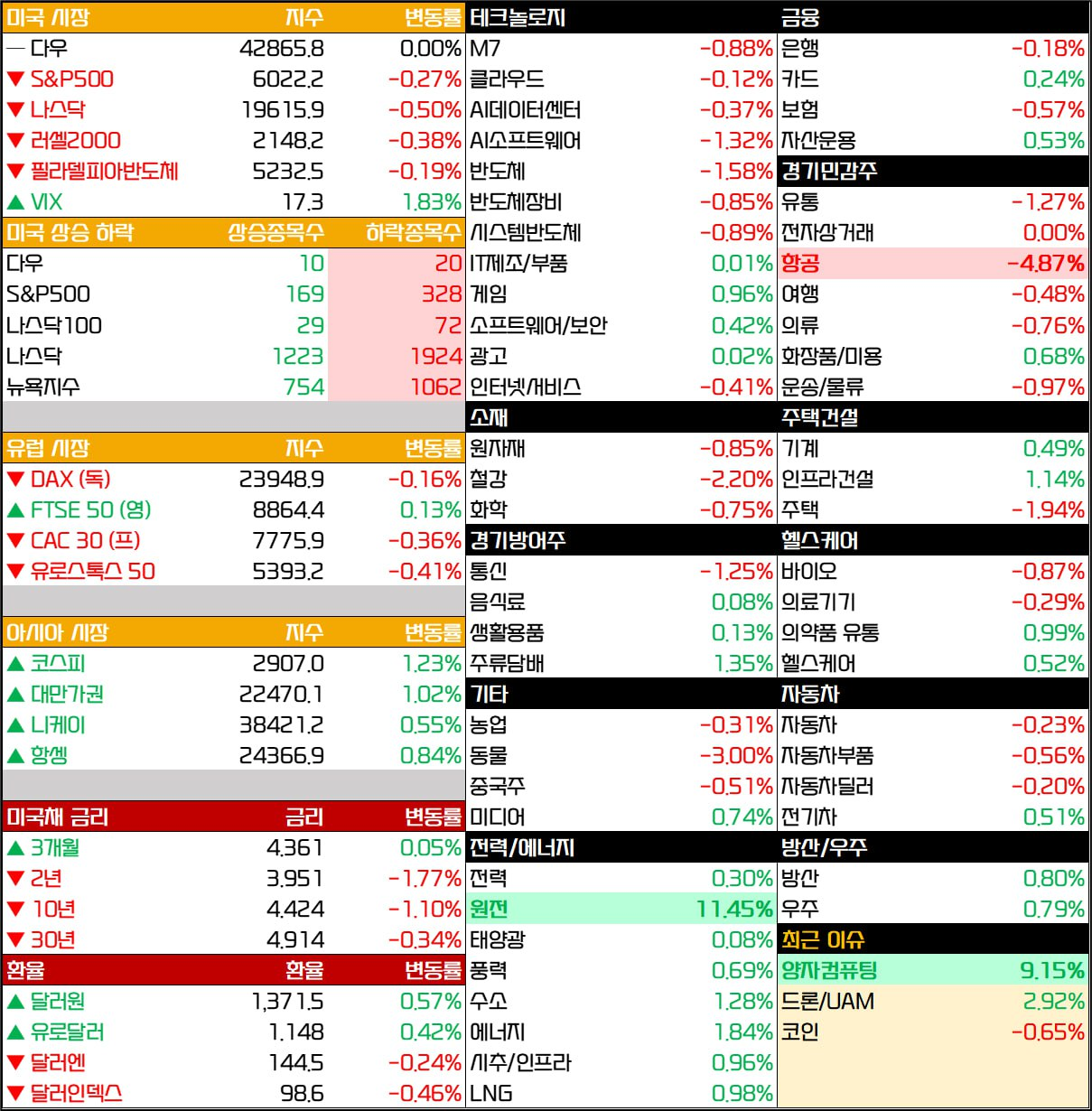 - 헬스케어, 에너지, 금융, 산업, 기술 업종은 비교적 양호한 흐름을 보였습니다