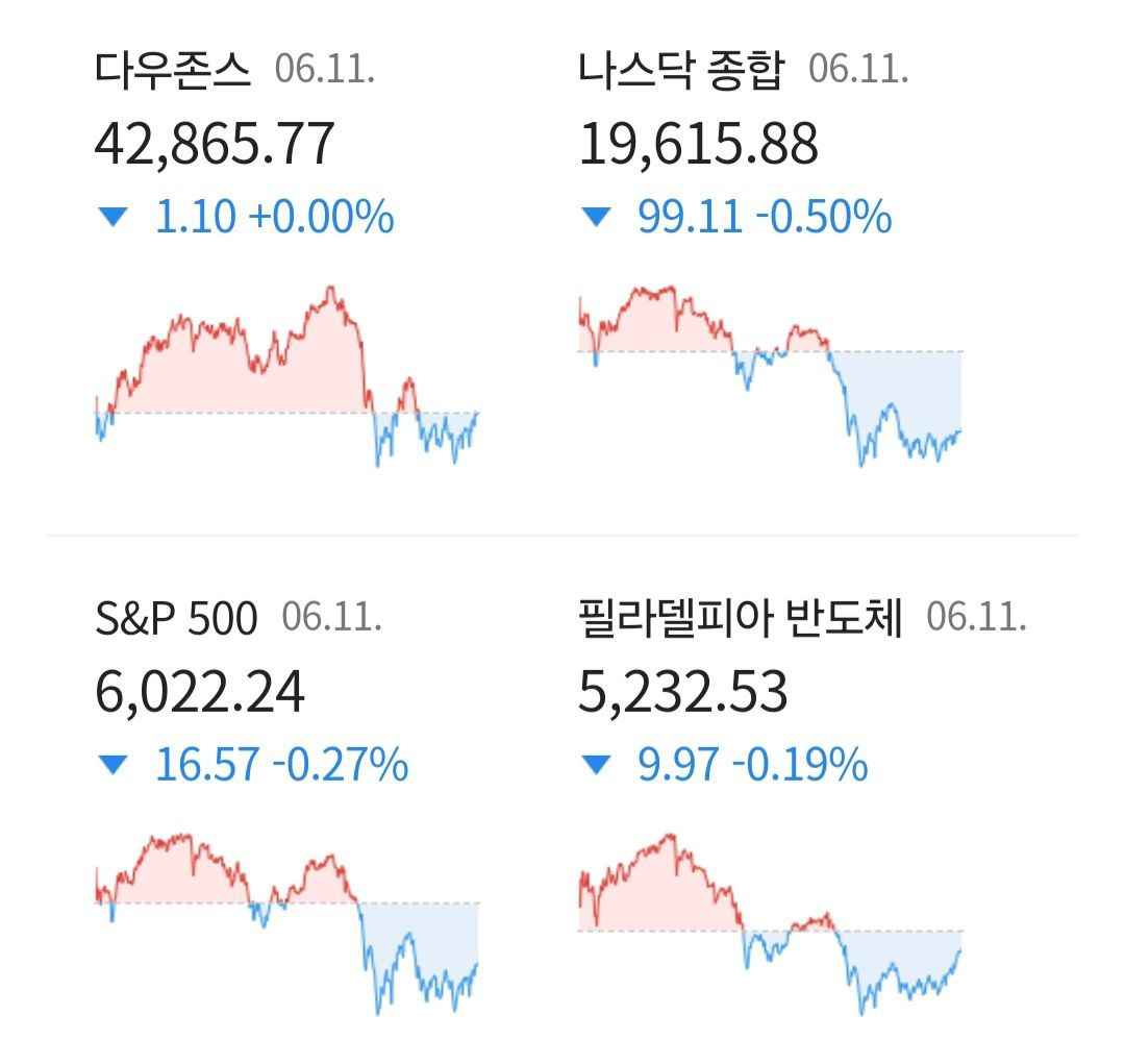 미국 뉴욕증시는 기대 이상의 소비자물가지수(CPI) 둔화와 미·중 무역 협상 진전이라는 호재에도 불구하고, 최근 상승에 따른 차익실현 매물과 지정학적 리스크 부각으로 인해 주요 지수가 하락 마감했습니다. 주요 3대 지수는 모두 소폭 하락했고, 필라델피아 반도체지수 역시 장중 낙폭을 줄이며 약세로 마무리되었습니다.