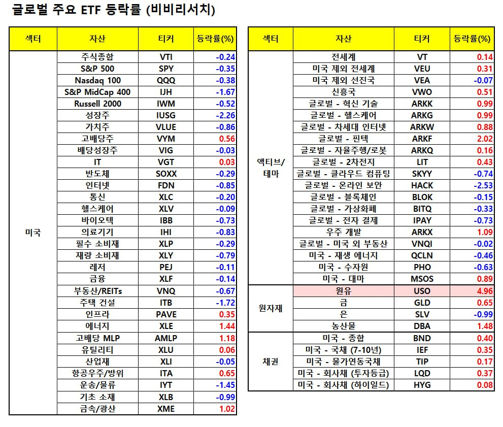 - 델타 항공(-4.86%), 아메리칸 에어라인(-6.59%) 등 항공 업종은 출장, 여행 등이 부진함을 시사한 소비자 물가지수 결과에 하락.