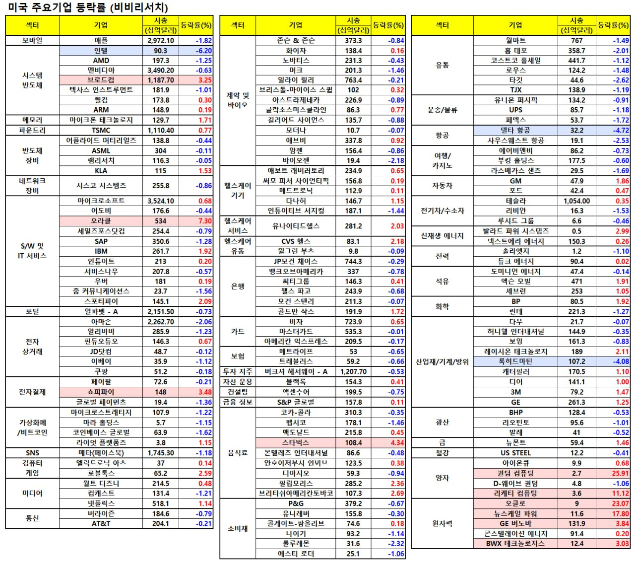 - 월마트(-1.56%), 코스트코(-1.04%), 타겟(-2.64%) 등 소매 유통업체들은 소비자 물가지수를 통해 향후 소비 둔화 우려가 부각되자 하락.