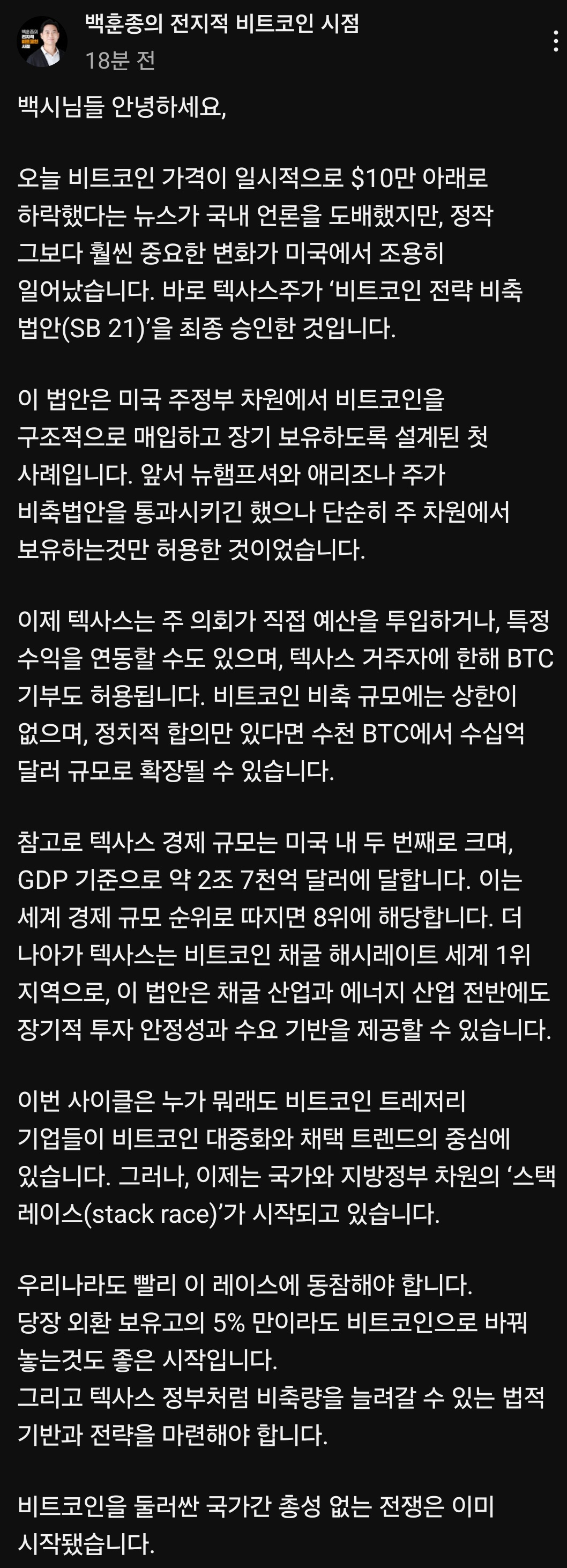 - 미국 텍사스 주에서 ‘전략적 비트코인 비축’ 법안이 현지 주지사의 서명으로 최종 통과됐다. 현지 ‘전략적 비트코인 비축’ 법안은 주정부가 비트코인을 준비자산으로 채택하고, 직접 투자할 수 있도록 허용하는 것이 골자다.