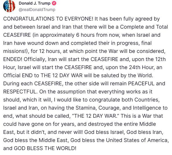 - 트럼프가 이스라엘과 이란이 완전한 휴전에 합의했다고 발표.
