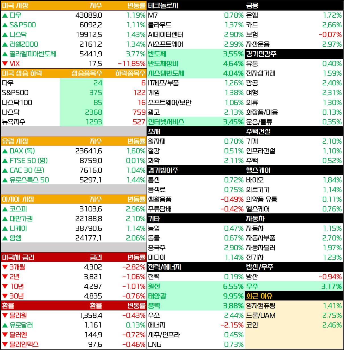 - 장중 EU의 보복 관세 언급이 있었지만 영향은 제한된 가운데, 시장은 긍정적인 소식에 민감한 반응을 보이며 상승세는 지속되며 사상 최고치에 근접(다우 +1.19%, 나스닥 +1.43%, S&P500 +1.11%, 러셀2000 +1.34%, 필라델피아 반도체 지수 +3.77%).