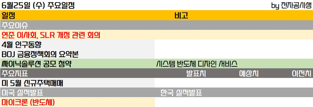 - 엔비디아(+2.59%)는 25일 주주총회를 앞두고 강세. AI 저전력 시스템 반도체 기업 암바렐라(+20.61%)는 회사 매각 고려 소식에 큰 폭 상승.
