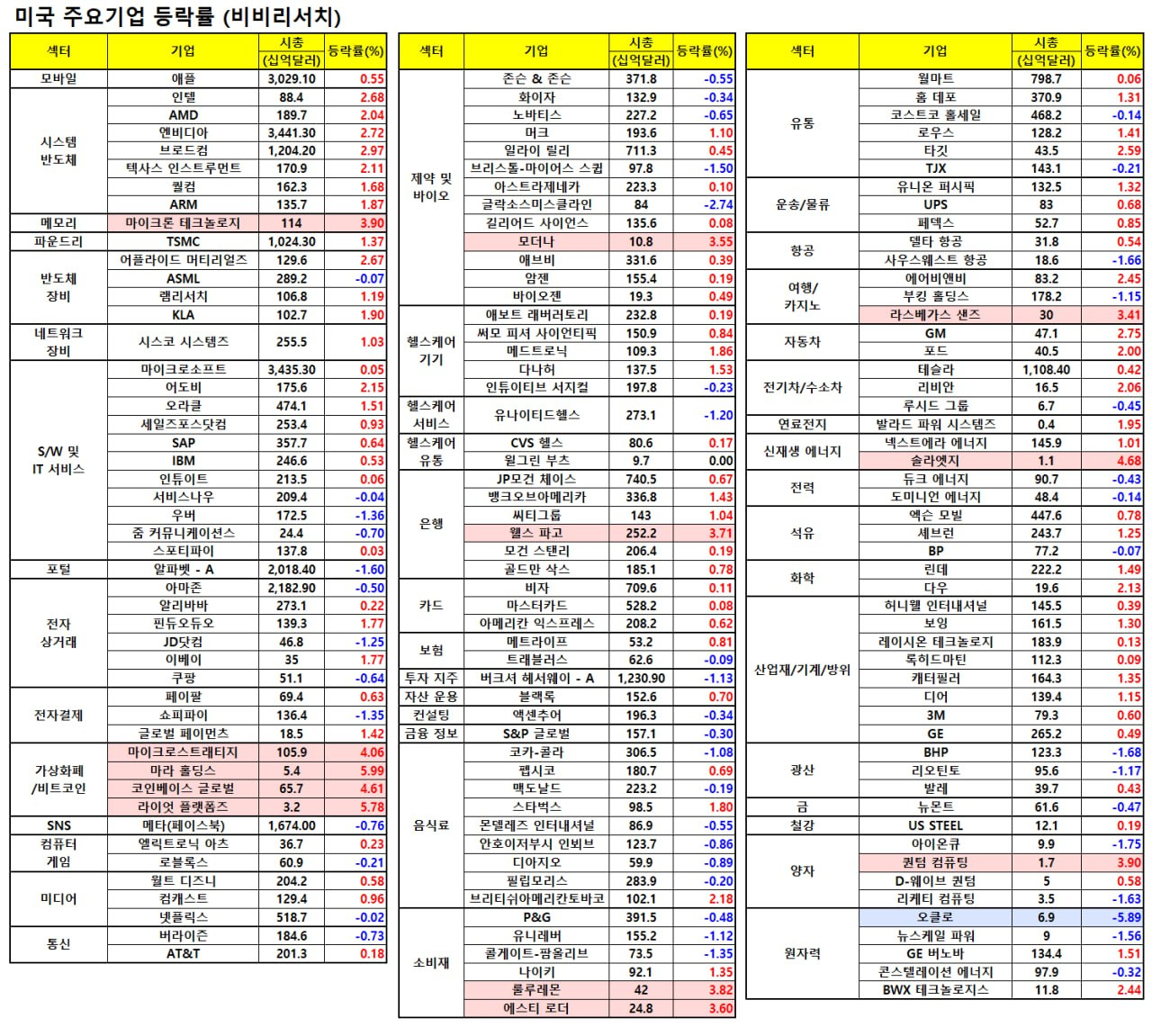 - 반면, 월마트(+0.21%), 코스트코(-0.12%)와 P&G(-0.55%) 등 경기 방어 관련 종목군은 보합권.