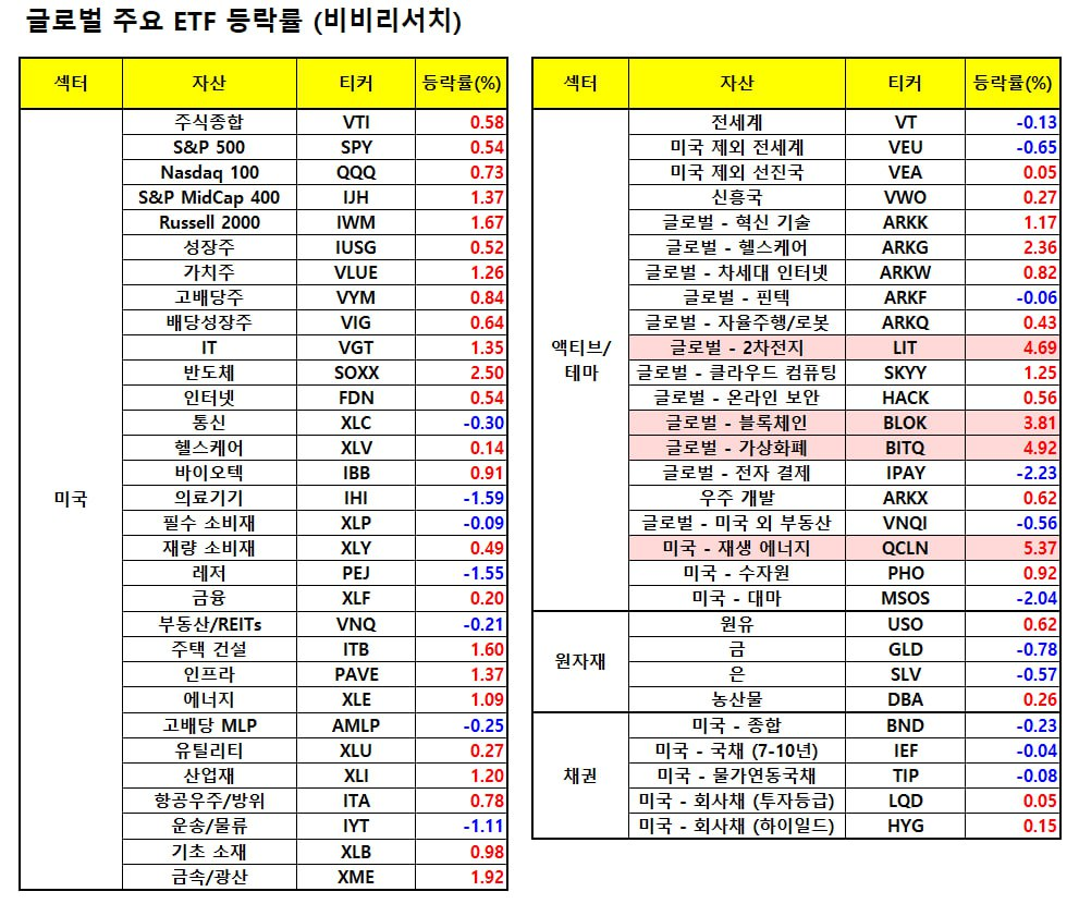 - 로켓랩(+0.45%), 인튜이티브 머신(+0.18%), 레드와이어(+6.53%) 등 우주개발 기업들은 스페이스X 매출이 NASA를 넘어설 것이라는 머스크의 발언에 상승. 결국 민간 우주 개발 산업의 활성화가 지속되고 있음을 보여주기 때문으로 추정.