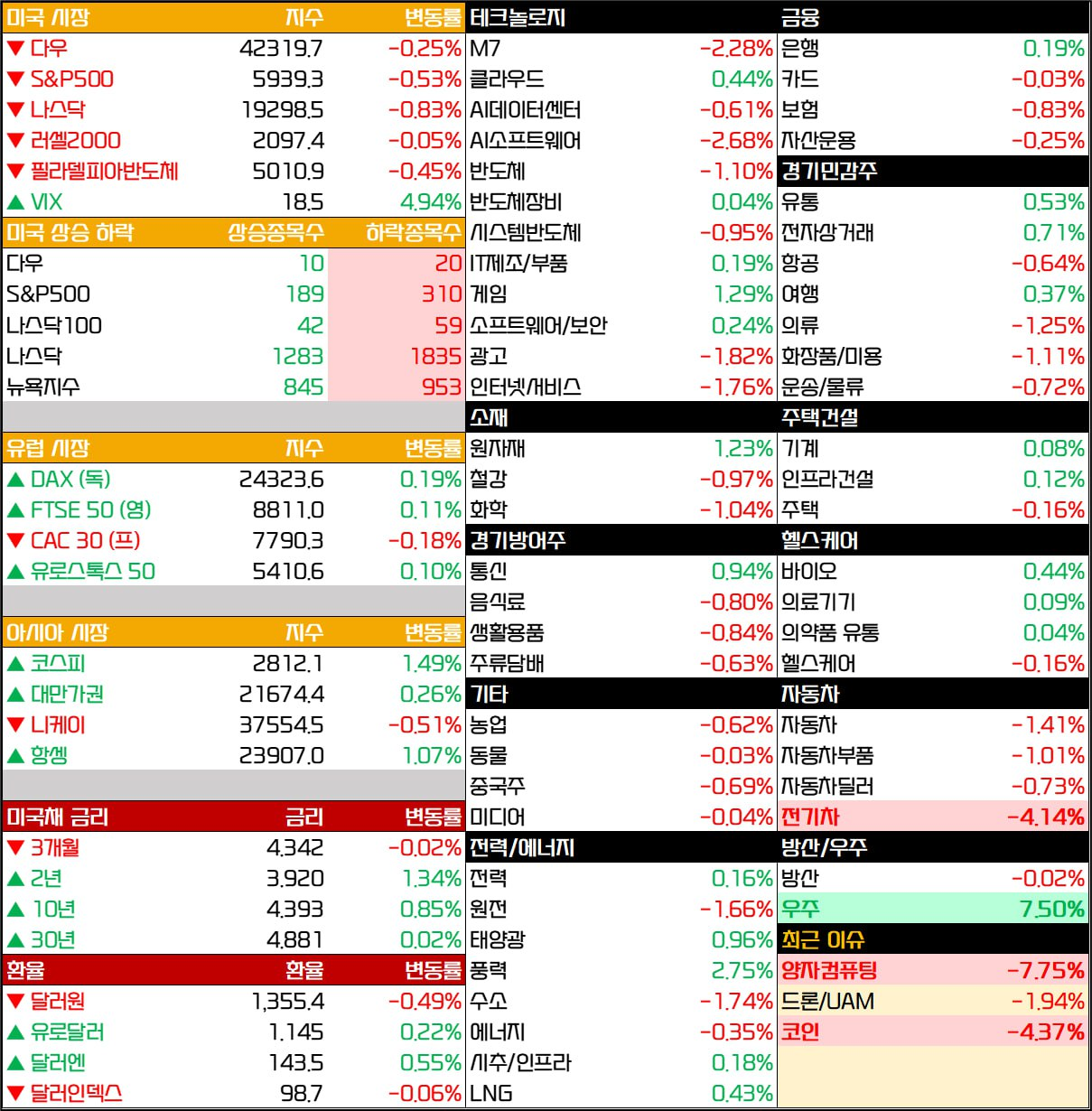 - 우주개발 관련 기업들은 엇갈린 흐름. 로켓랩(-1.71%), 인튜이티브 머신(-1.63%)은 하락한 반면, 레드와이어(+3.88%)는 상승.
