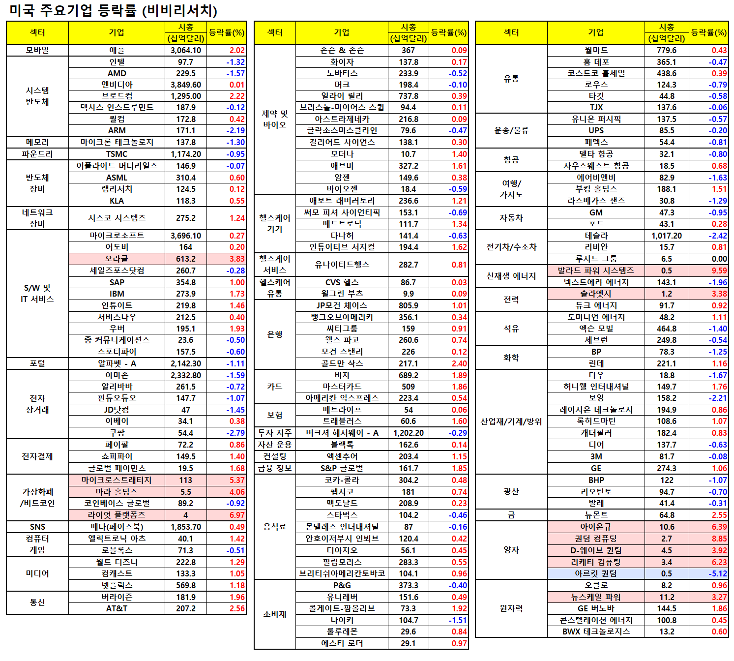 지난밤 미국 주요 종목 동향 (시간외 반영)