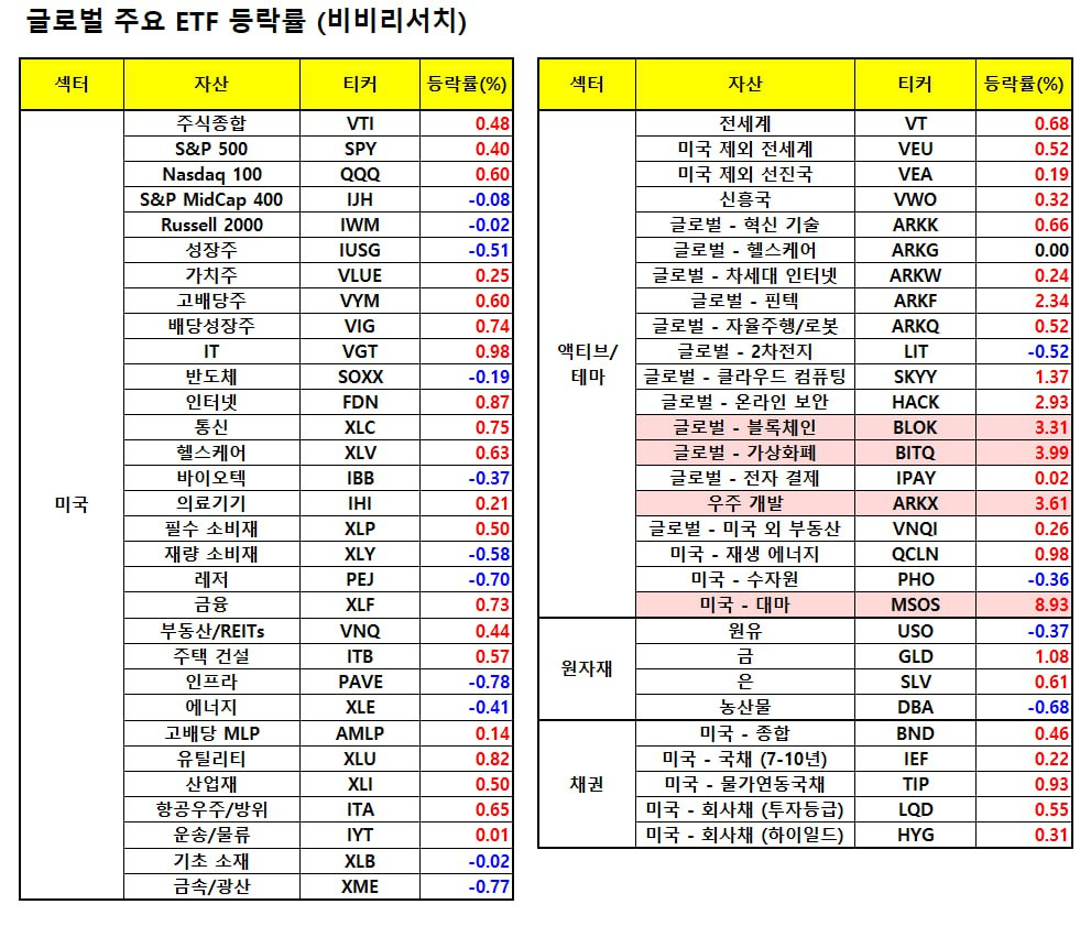 로빈후드(+12.77%)는 유럽 사용자 대상으로 미국 주식을 블록체인 상에서 24시간 거래할 수 있는 토큰화 주식 서비스를 출시했다는 소식에 큰 폭 상승. 골드만삭스의 목표주가 상향 조정도 영향.