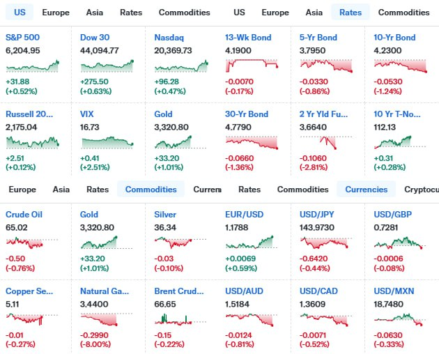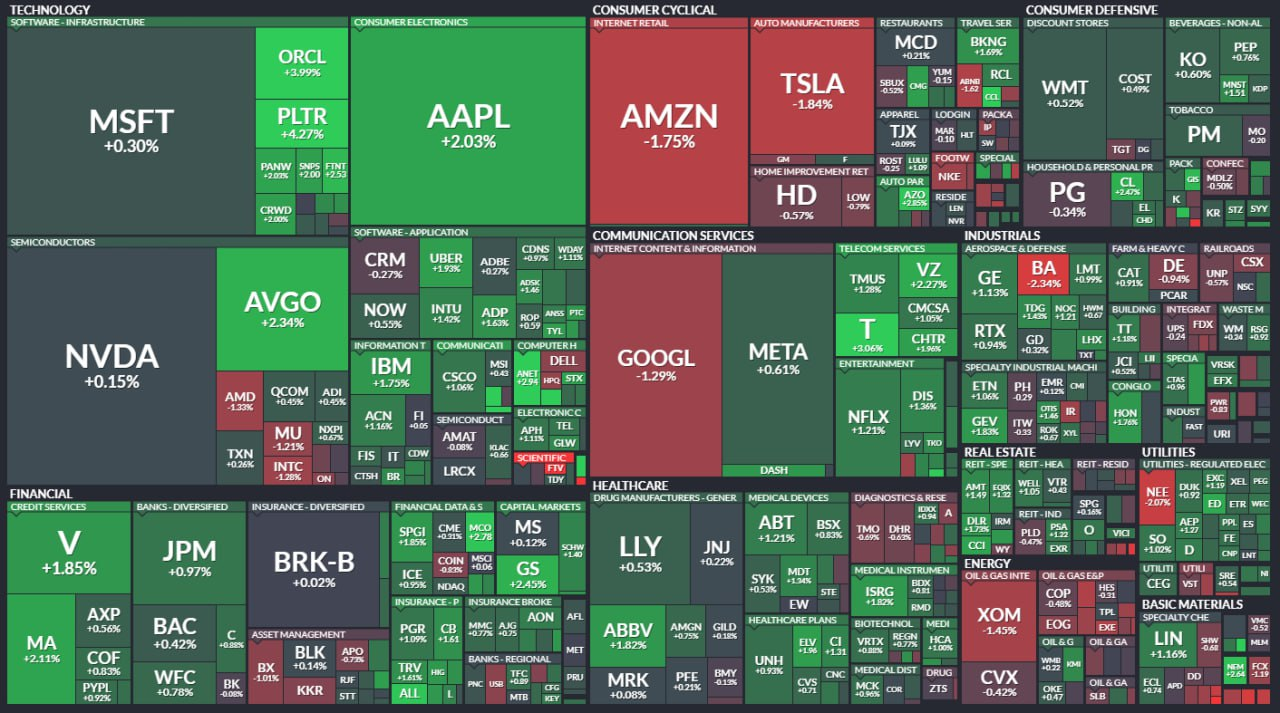 • S&P 500 +0.56%(6,207.89), 나스닥 +0.62%(20,398.39), 다우 +0.64%(44,099.80)로 사상 최고치 경신.