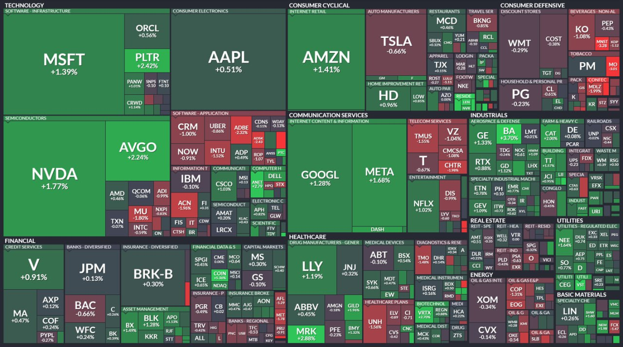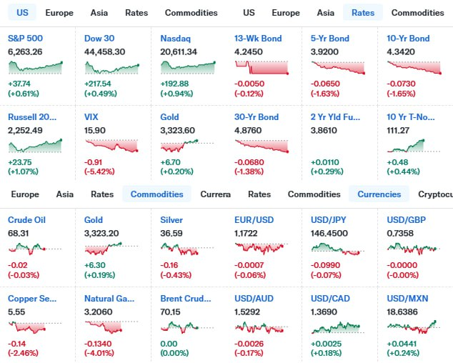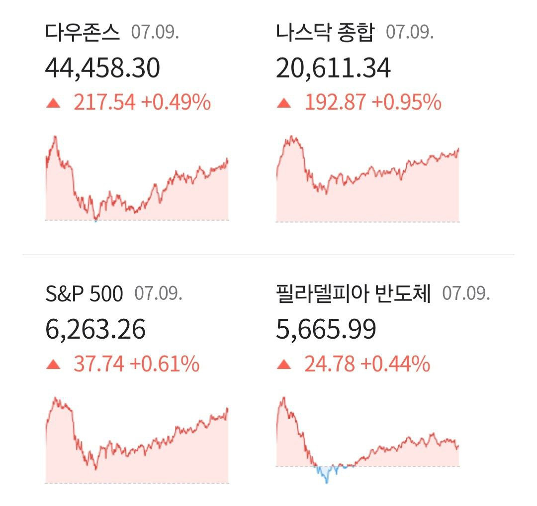 - S&P 500 +0.60%(6,262.97), 나스닥 +0.93%(20,608.37), 다우 +0.50%(44,463.96) — 빅테크 강세·비트코인 랠리·AI 기대감에 상승 마감.