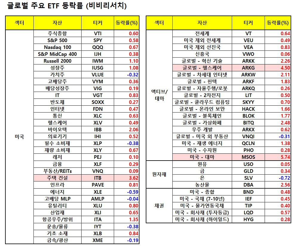 - 물론, 소비 관련 종목군은 부진을 보인 차별화도 특징(다우 +0.49%, 나스닥 +0.94%, S&P500 +0.61%, 러셀2000 +1.07%, 필라델피아 반도체지수 +0.44%)