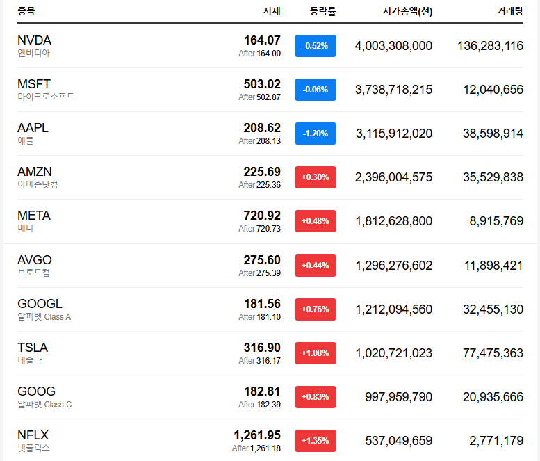 지난밤 미국 주요 종목 동향 (시간외 반영)