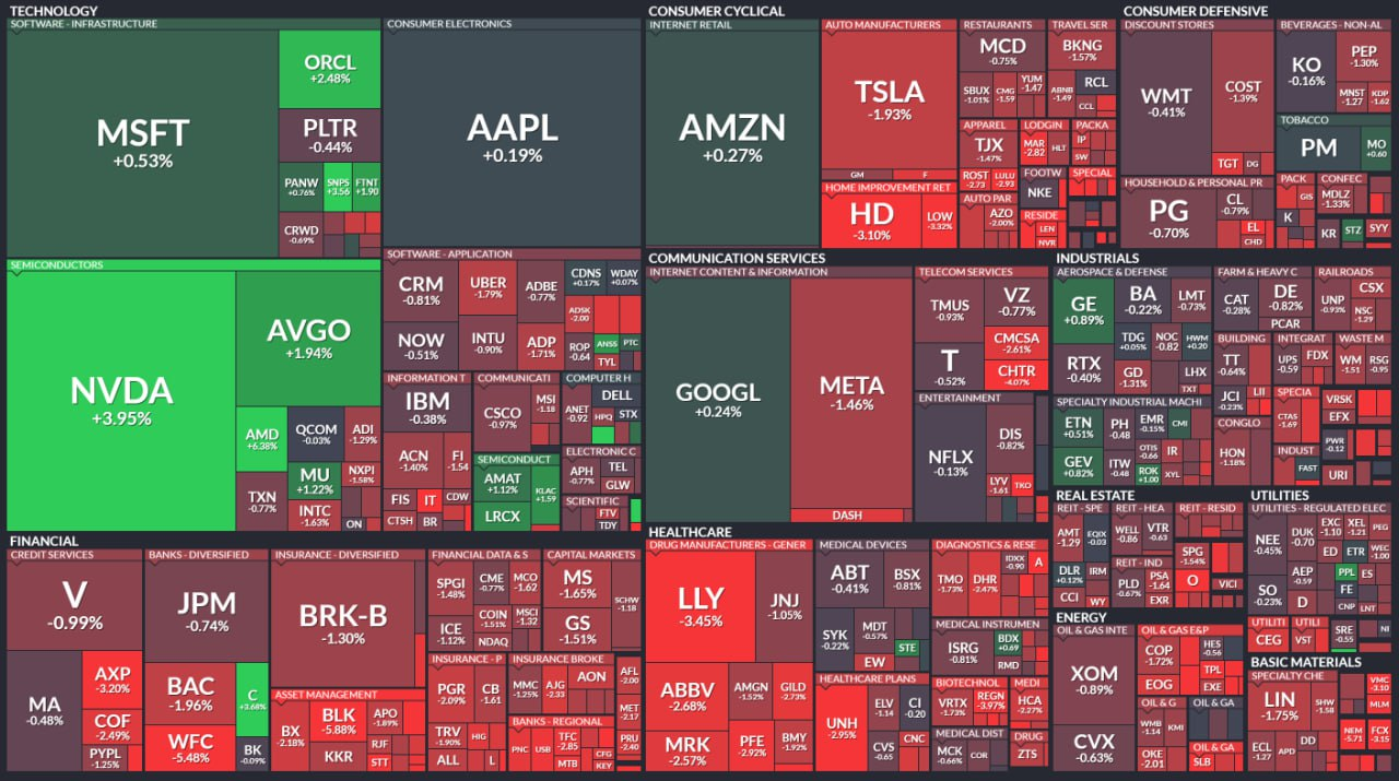 - 혼조세로 나온 CPI 데이터가 관세로 유발된 인플레이션에 대한 우려감을 덜어내는데 실패하며 엔비디아와 반도체 업종, 빅테크 및 AI 관련주를 제외한 대부분의 종목 및 업종 하락