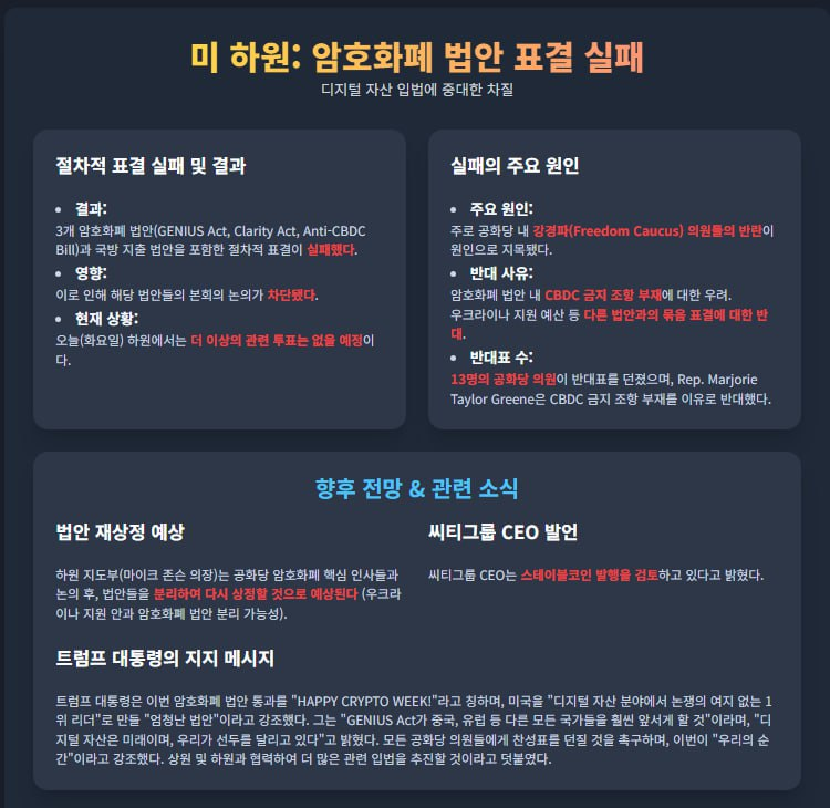 - 美 하원, 오늘 암호화폐 법안 재투표 않기로