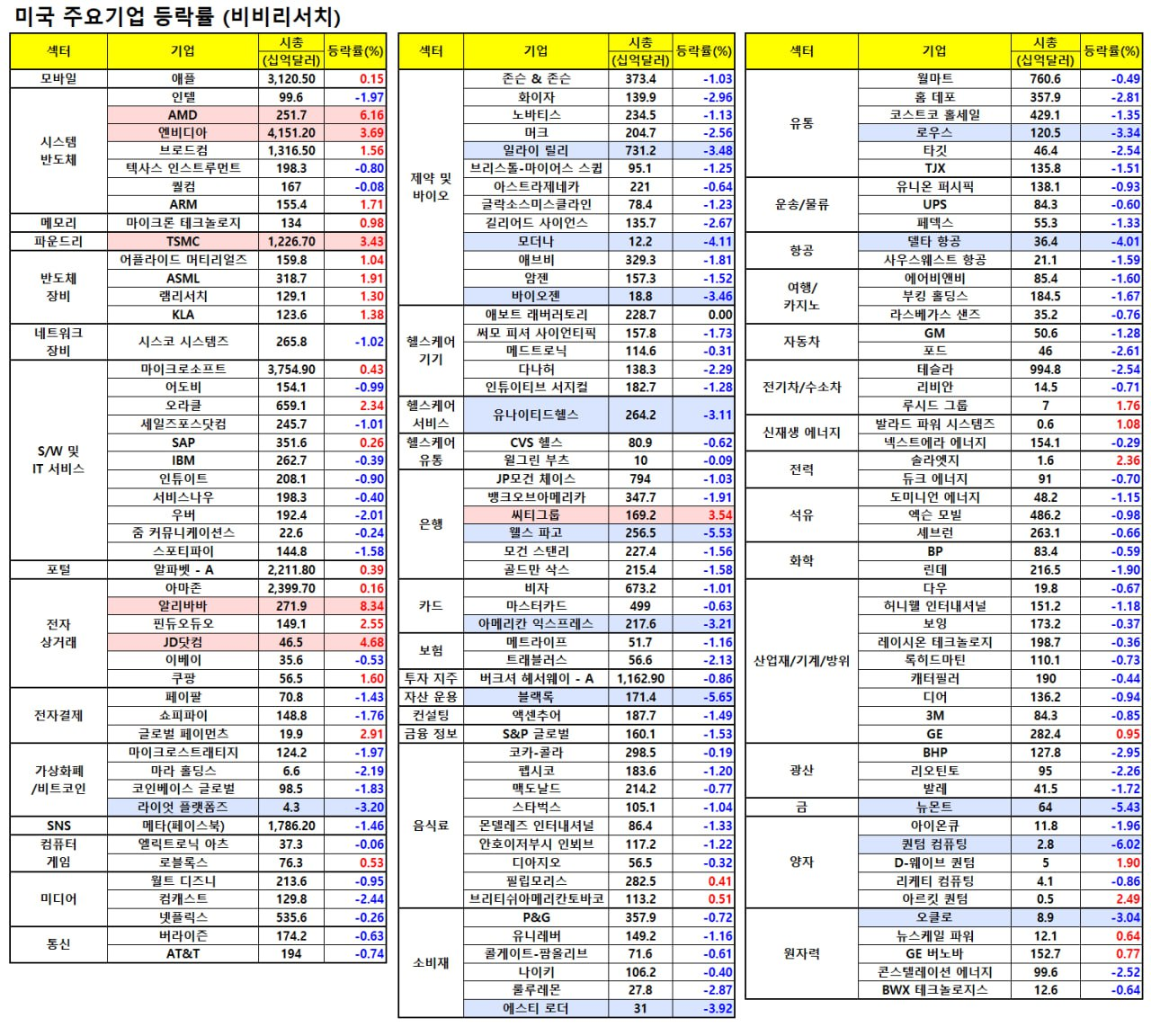 - AMD(+6.41%)는 최근 HSBC가 AMD의 신규칩이 엔비디아 차세대 칩과 경쟁이 가능하다며 긍정적인 평가를 한 데 힘입어 지속적인 상승.