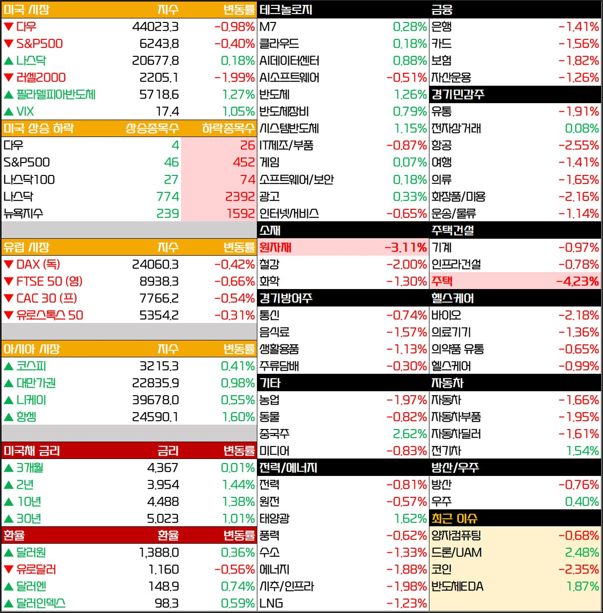 - 시장에서는 하반기 관세 반영에 따른 인플레이션 재상승 위험을 경계하며, 10년물 국채 금리는 4.5%에 근접, 달러화도 강세.