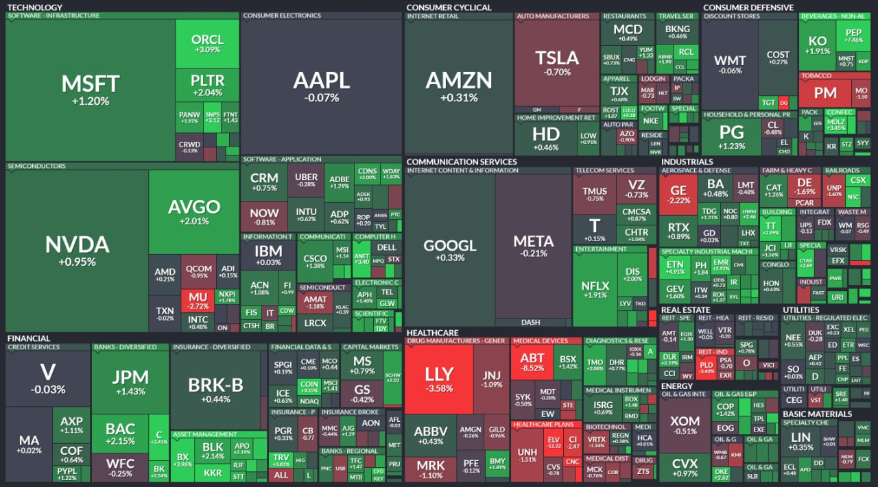 - 공구 업체 Snap-On은 실적 발표 후 7% 급등했고 GE Aerospace는 가이던스를 상향했음에도 불구하고 주가는 -2% 하락했습니다