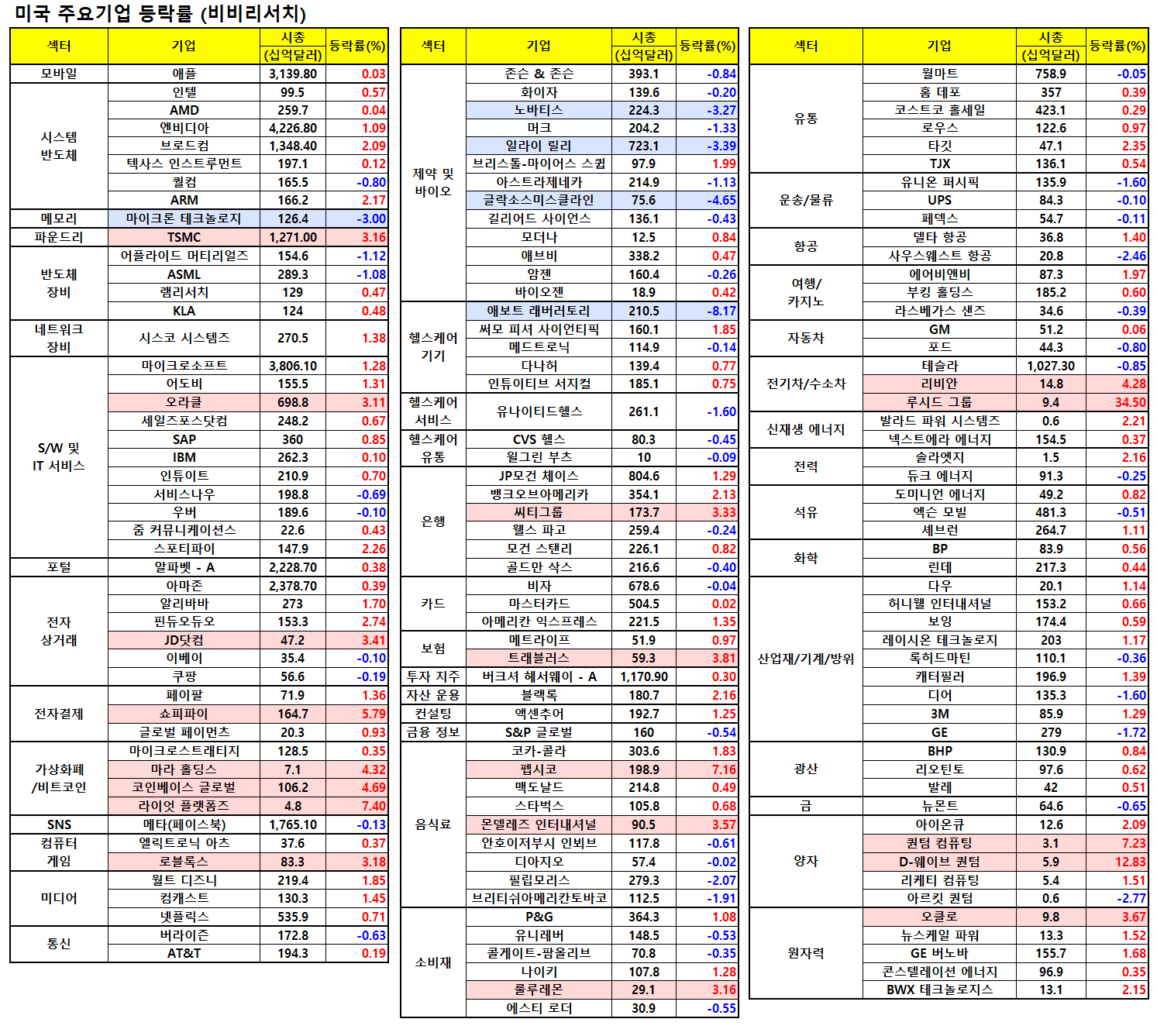 - 브로드컴(+2.01%)도 최근 엔비디아와의 AI 경쟁에서 새로운 토마호크 울트라 네트워킹 칩 출시 후 상승세 지속.