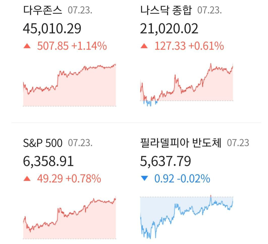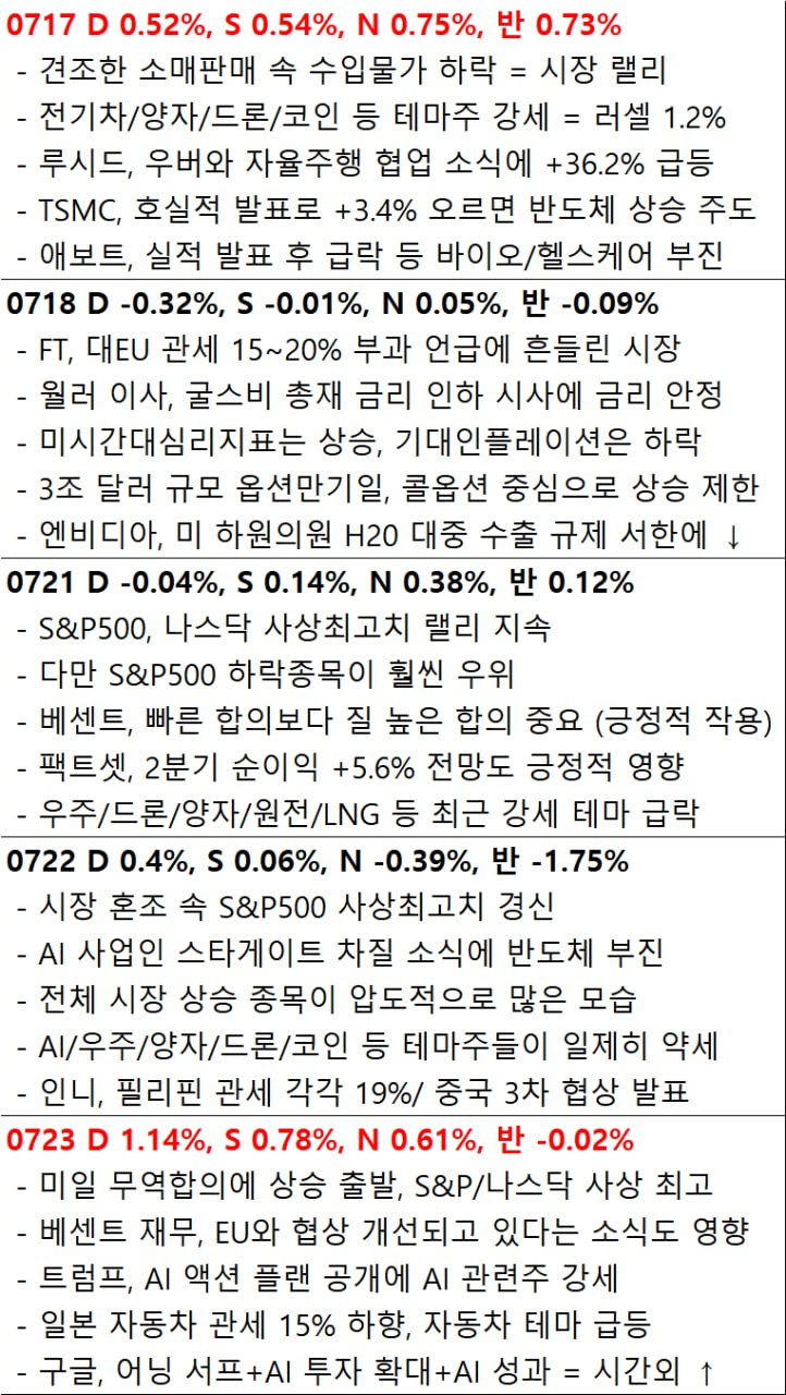 - 배경: 트럼프 전 대통령의 미-일 무역협상 타결 발표와 EU 협상 진전 기대감, 그리고 AI 정책 발표(AI Action Plan)가 시장 낙관론을 자극.