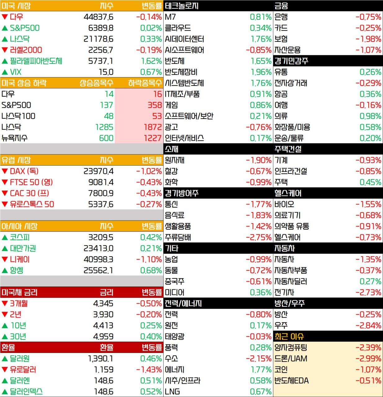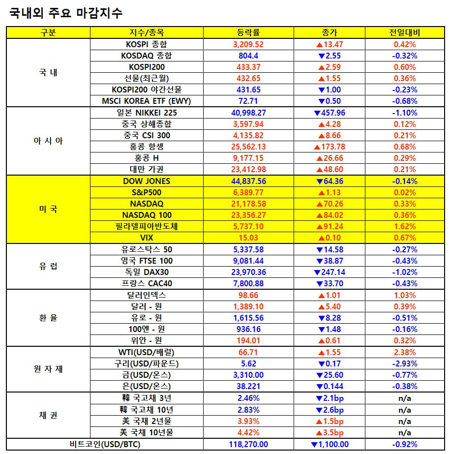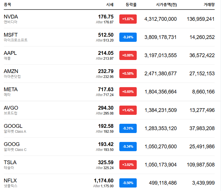 - 마이크론(-0.01%)도 부진. 인텔(-0.10%)은 실적 발표 후 미래 전략에 대한 불안을 반영하며 하락.