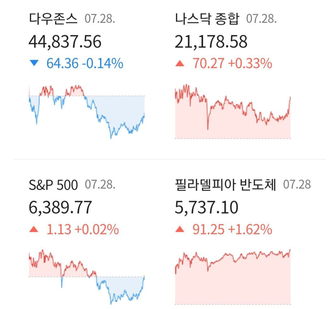- 07/29 미 증시, 미-EU 협상 타결 후 경기에 주목하며 매물 소화하며 혼조 마감