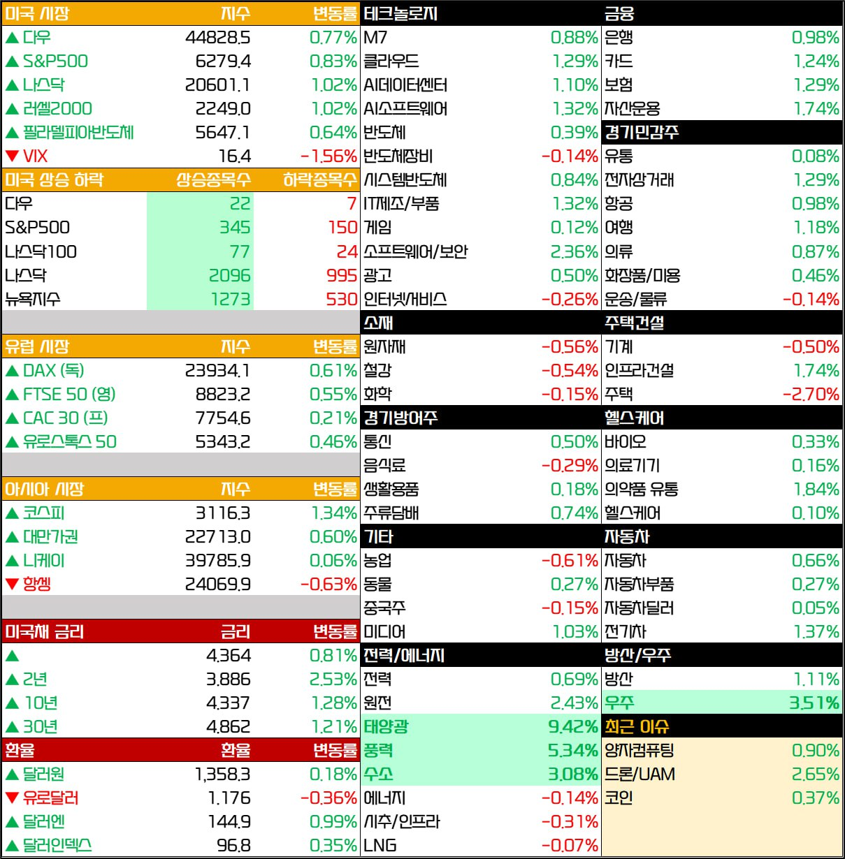 - 세 지수 모두 상승 마감, S&P500과 나스닥은 사상 최고치 재경신. 다우지수도 사상 최고치(45,073.63pt)에 불과 250pt 차이로 접근.