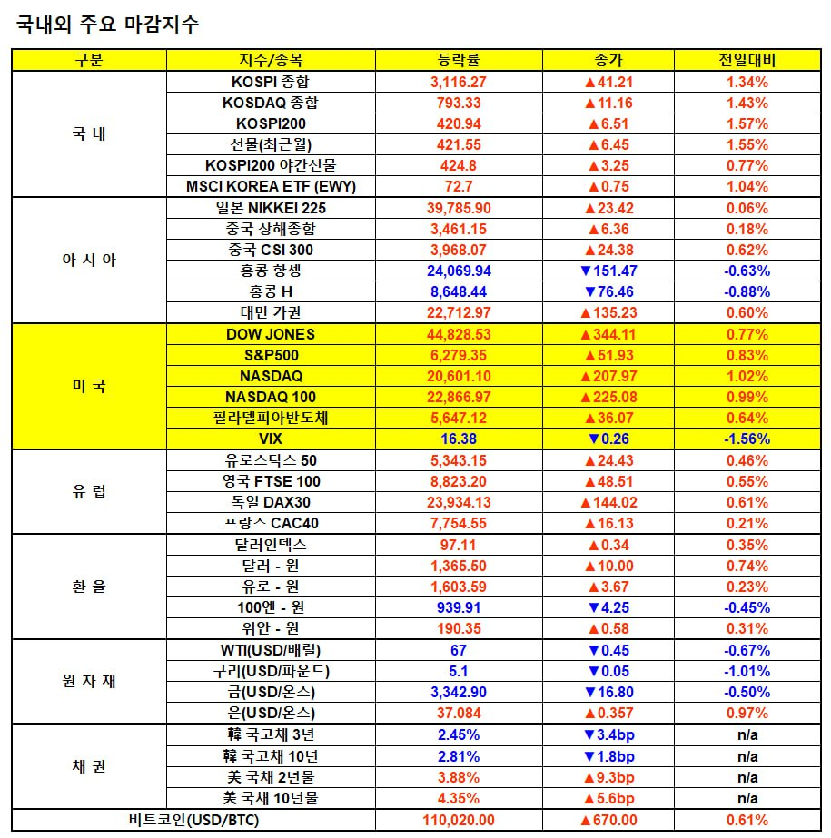 - 세 지수 모두 상승 마감, S&P500과 나스닥은 사상 최고치 재경신. 다우지수도 사상 최고치(45,073.63pt)에 불과 250pt 차이로 접근.