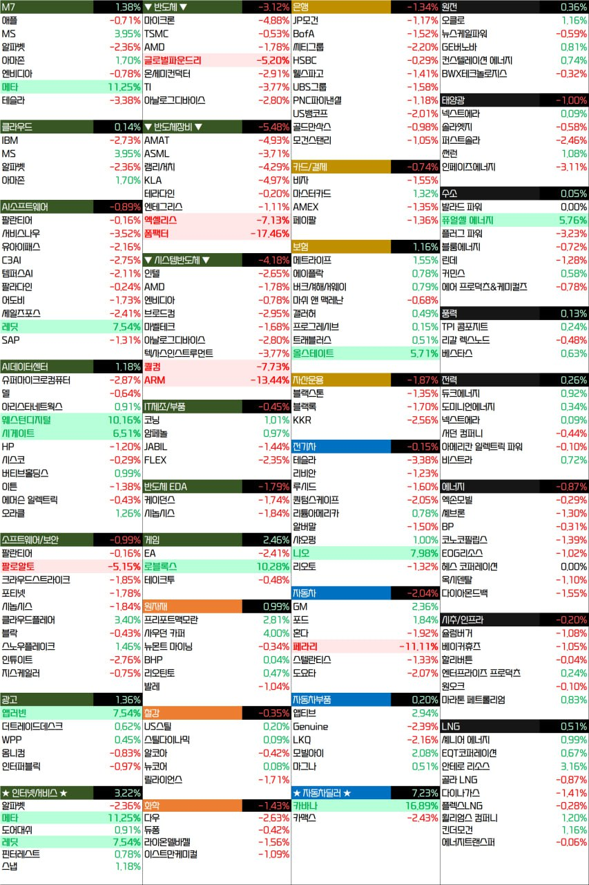 - 메타 플랫폼(+11.25%)은 AI 제품 수요가 확대되고 있다는 점을 반영하며 크게 개선된 실적을 발표하자 큰 폭으로 상승.