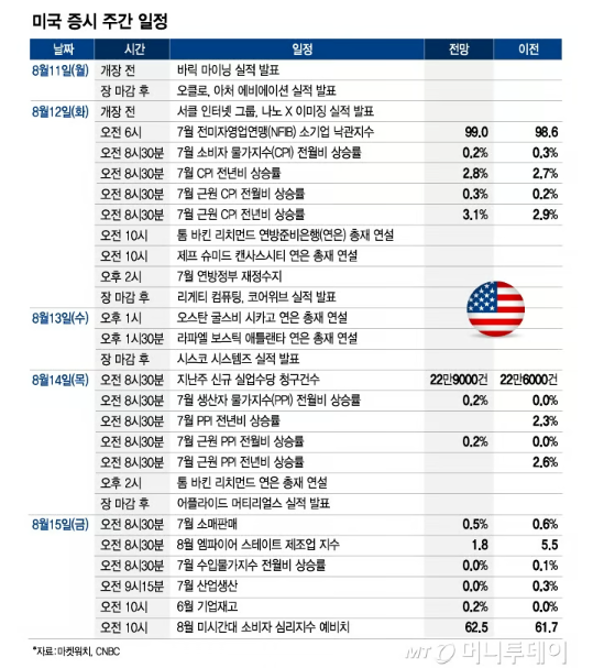 - 오는 12일에는 지난 7월 소비자 물가지수(CPI)가, 14일에는 7월 생산자 물가지수(PPI)가 각각 발표된다.