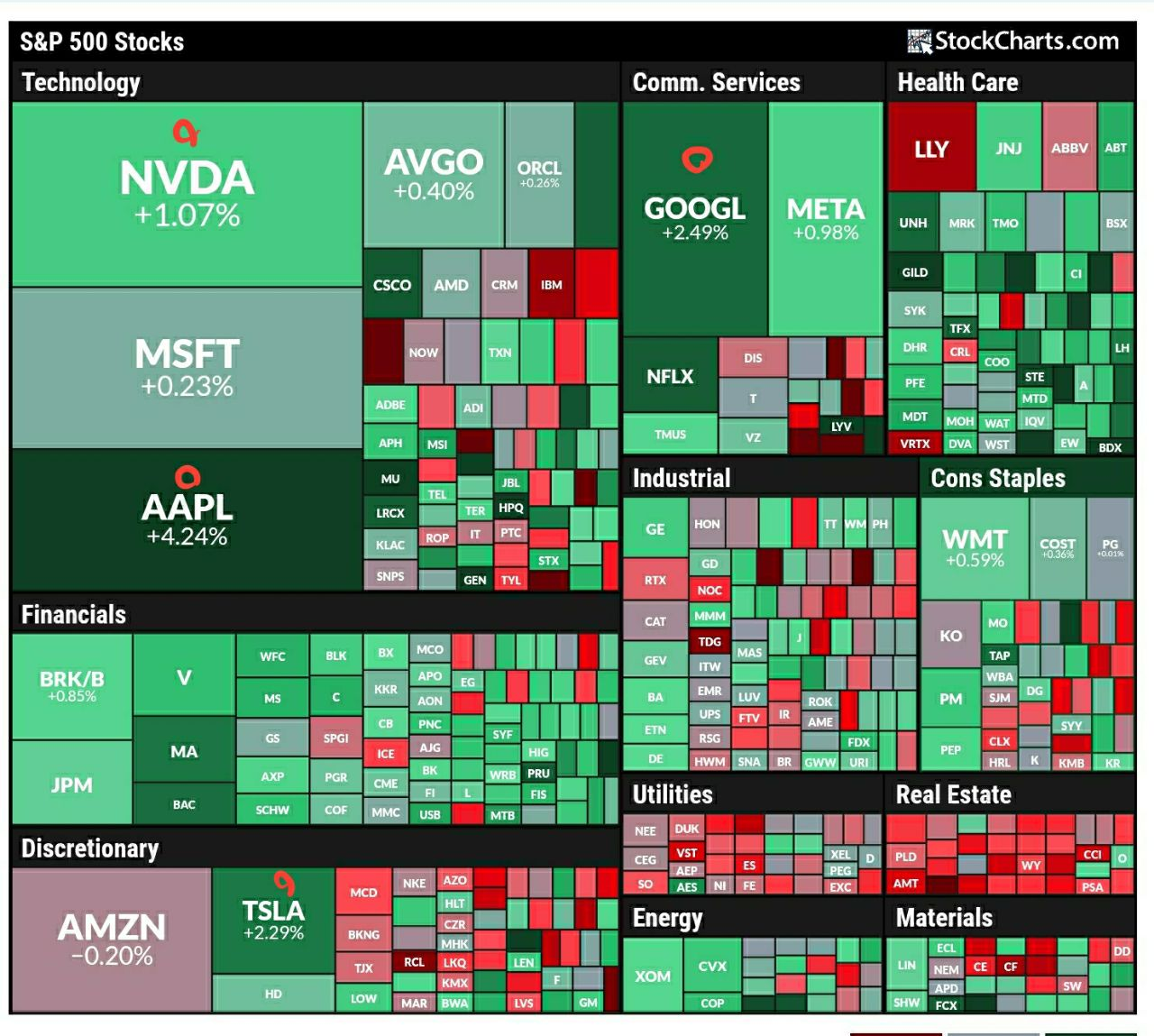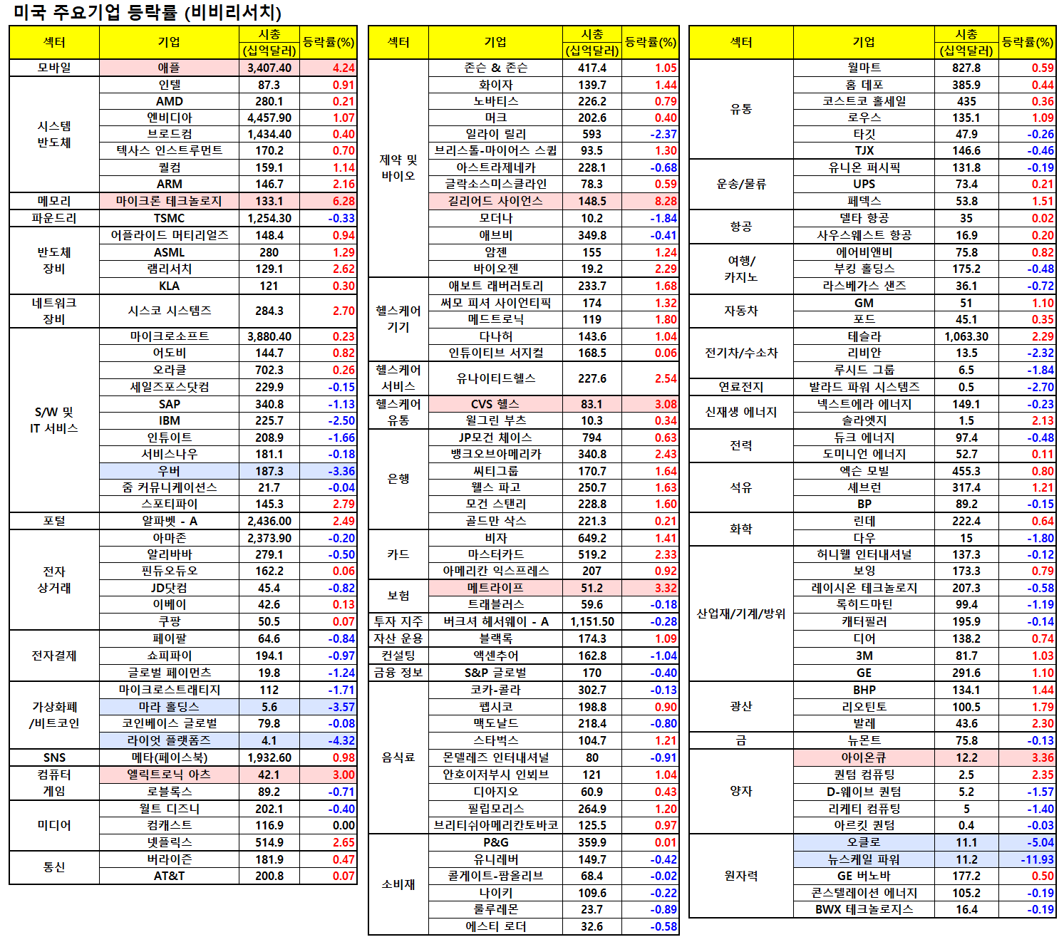 - 애플(+4.2%)은 미국 정부와의 관세 협상 재개로 주가가 상승세를 보였으며, 미국 내 제조 확대 계획이 투자자들에게 긍정적인 신호를 줌.
