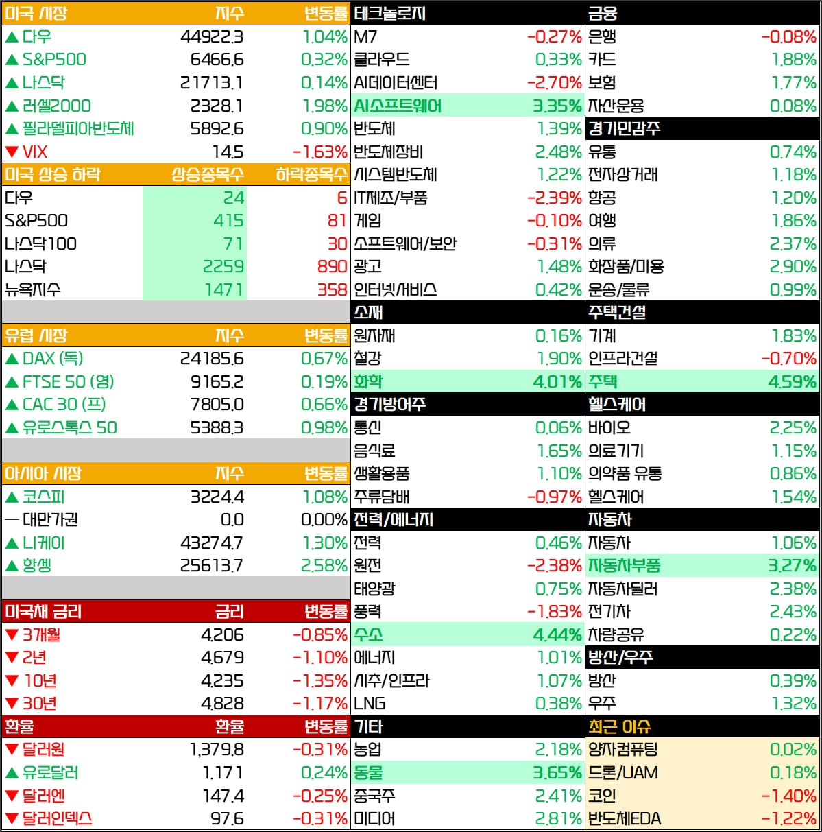 - 한편, 코어위브 여파로 AI로 인한 상승했던 브로드컴(-1.20%), 마이크론(-2.72%), TSMC(-1.17%)등도 매물 소화하며 하락.