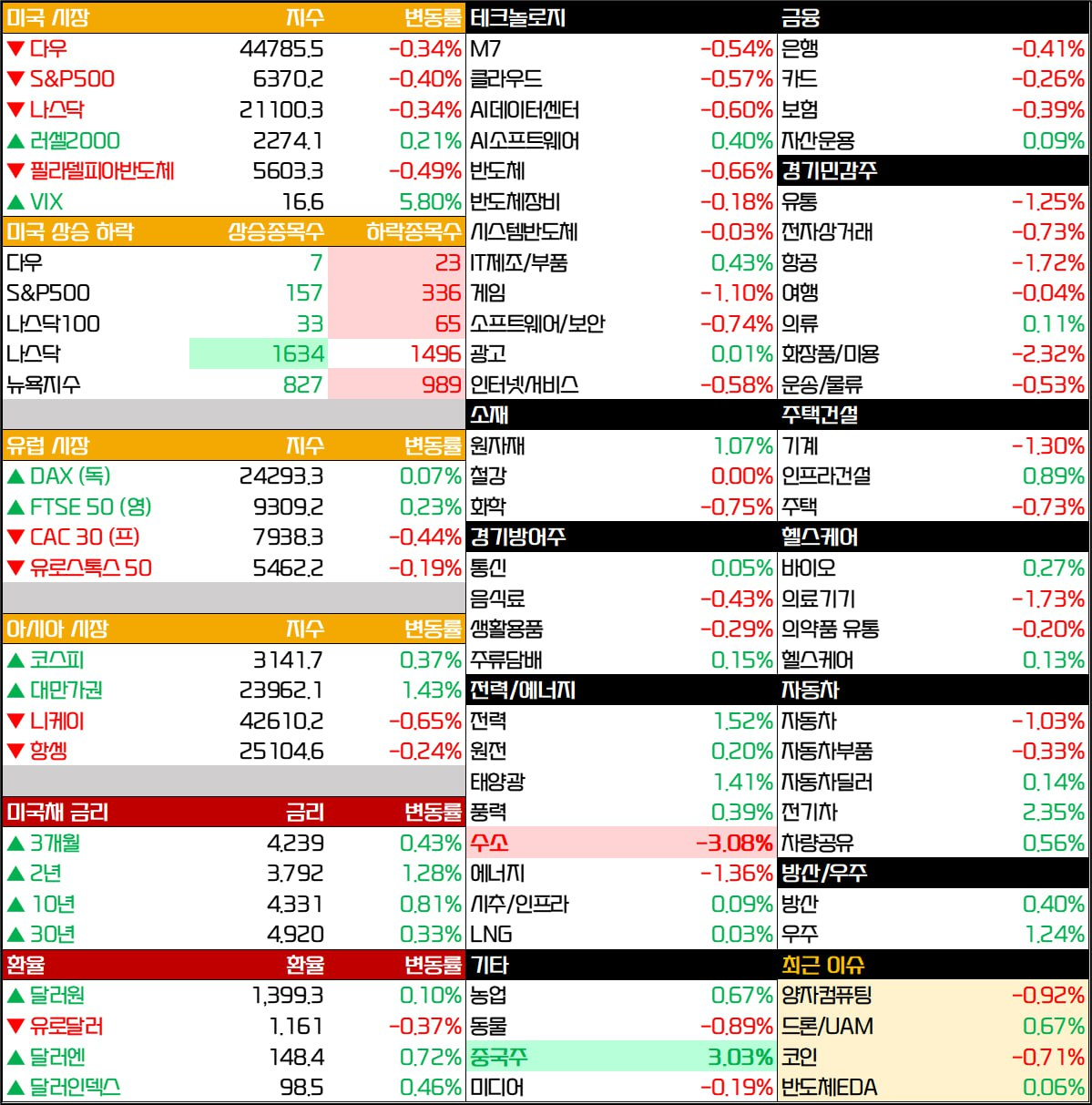 - 에너지 섹터도 상승했습니다. 반면 소비재(필수/재량) 섹터는 부진한 흐름을 보였습니다