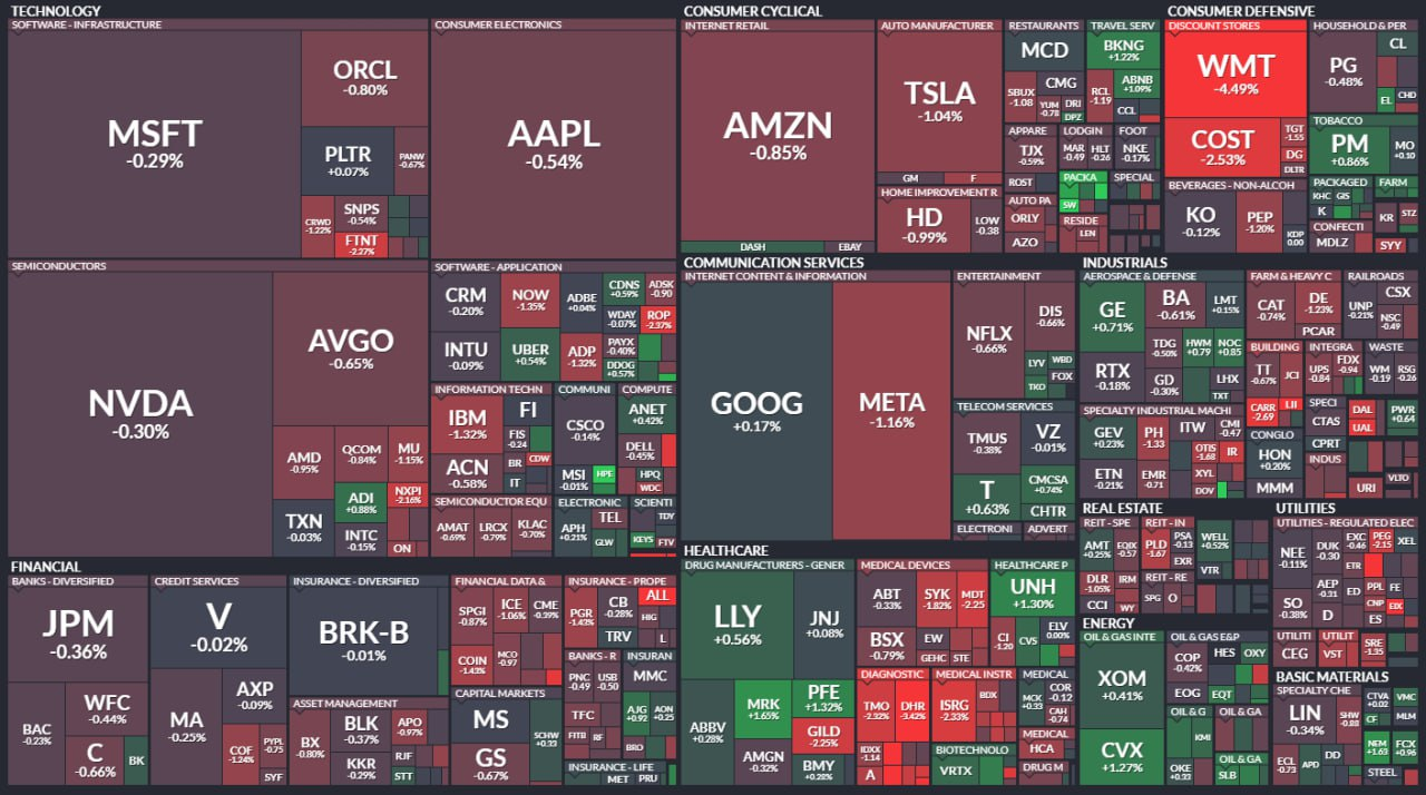 - 소매 기업 대장주 월마트 $WMT 실적 발표 후 -4% 하락. 그러나 EPS 미스, 관세로 인한 비용 상승 및 비용 흡수에도 불구하고 가이던스 상향. 월마트가 소매 기업들 끌어내리며 필수 소비재 섹터 가장 큰 폭으로 하락