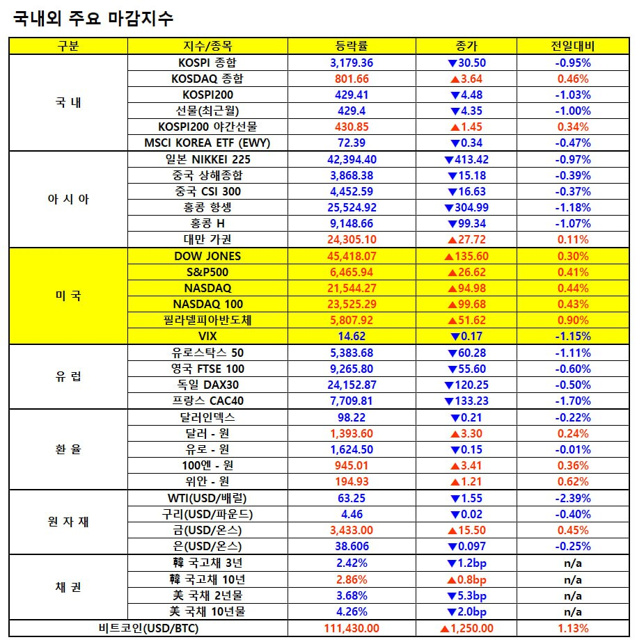 - 메타 플랫폼(+0.11%)은 초지능 연구소 설립 후 핵심 연구원들이 퇴사가 이어지고 있다는 소식에도 장 마감 직전 상승 전환.
