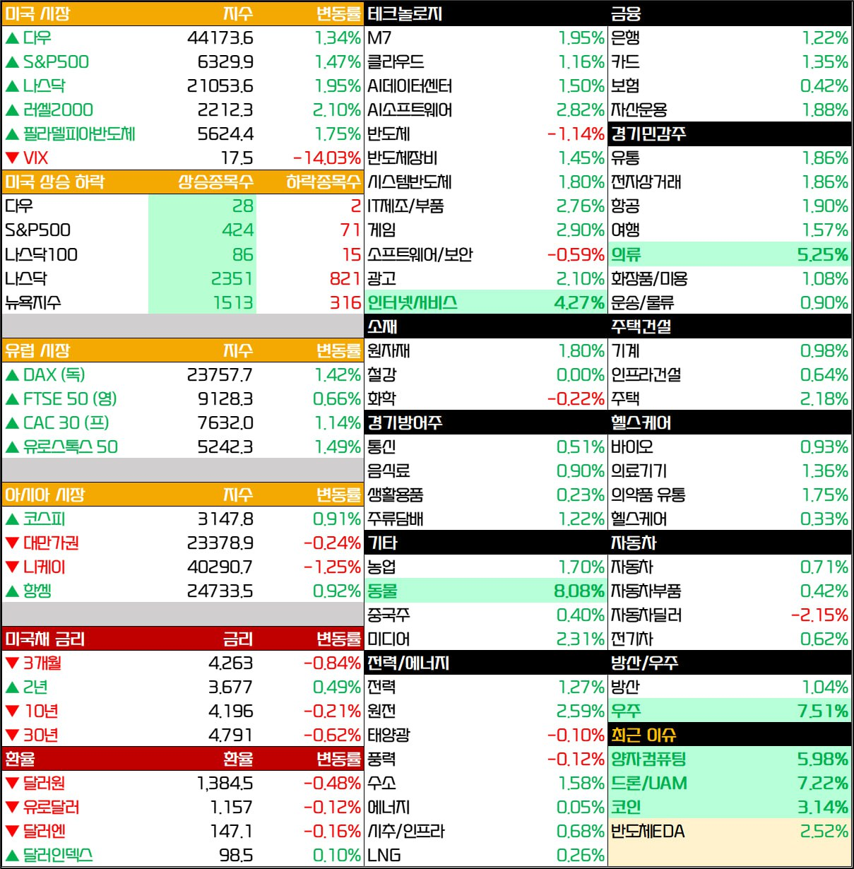 - S&P500, 나스닥 지수는 전일대비 1.5%, 1.95% 상승. 상대적으로 부진했던 다우 지수도 1.3% 상승