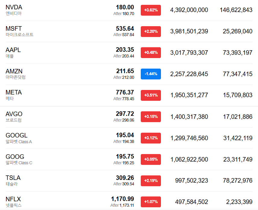 - 특히 엔비디아, 마이크로소프트 등 대형 기술주(빅테크)와 AI 관련주들이 일제히 급등하며 시장의 상승을 견인했습니다.