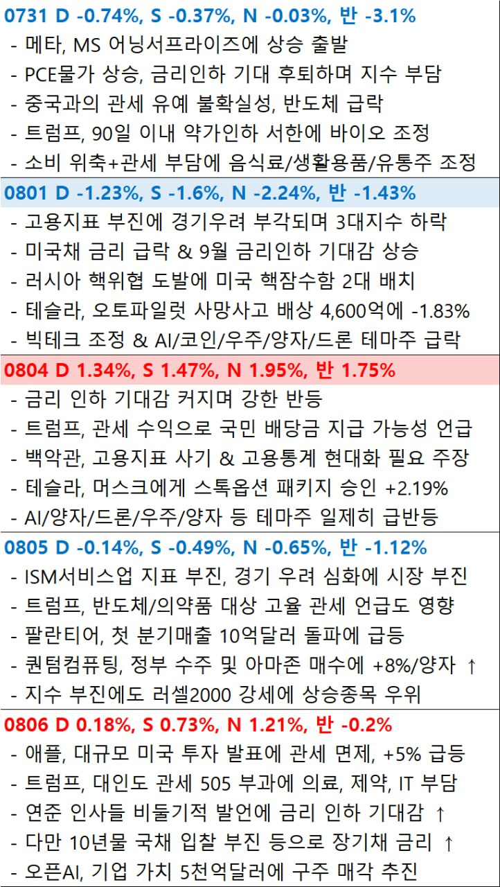 - 이처럼 금리 정책, 글로벌 무역 규제, AI 밸류에이션 등 다양한 요인이 맞물리며 장 초반에는 불확실성이 혼재, 그러나 기술주 중심으로 투자 심리는 빠르게 회복되는 모습.