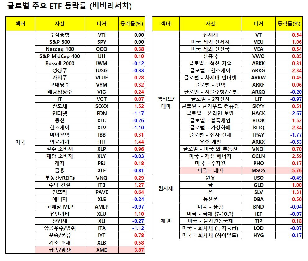 - 메타플랫폼(-1.32%)을 비롯해 알파벳(-0.22%)등은 경기 불안이 결국 광고 수익 악화 우려를 자극할 수 있다는 점이 부각되자 하락.