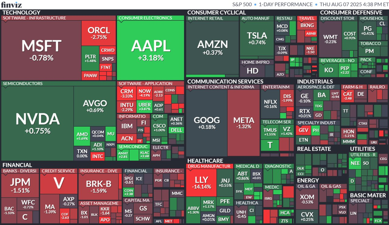 - - 일라이 릴리는 예상치를 뛰어넘는 2분기 실적과 연간 전망치 상향을 발표했음에도 비만 치료제 임상 결과가 실망을 안기며 14% 하락. 애플은 미국 내 1,000억 달러 추가 투자 계획 발표 후 약 3% 상승.