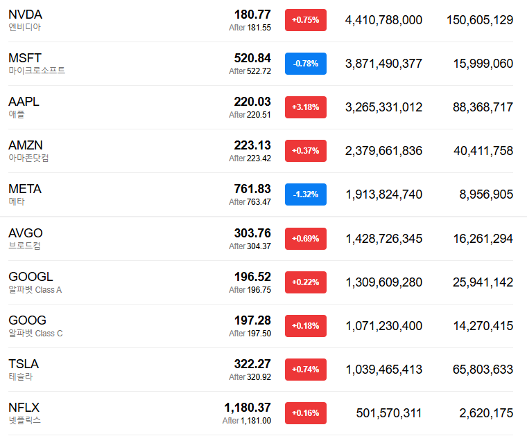 - 애플(+3.18%)은 전일에 이어 미국 투자 확대 소식이 긍정적으로 작용하며 상승세가 지속. 관련 투자로 트럼프 발 혜택 기대가 부각된 데 힘입은 것으로 추정.