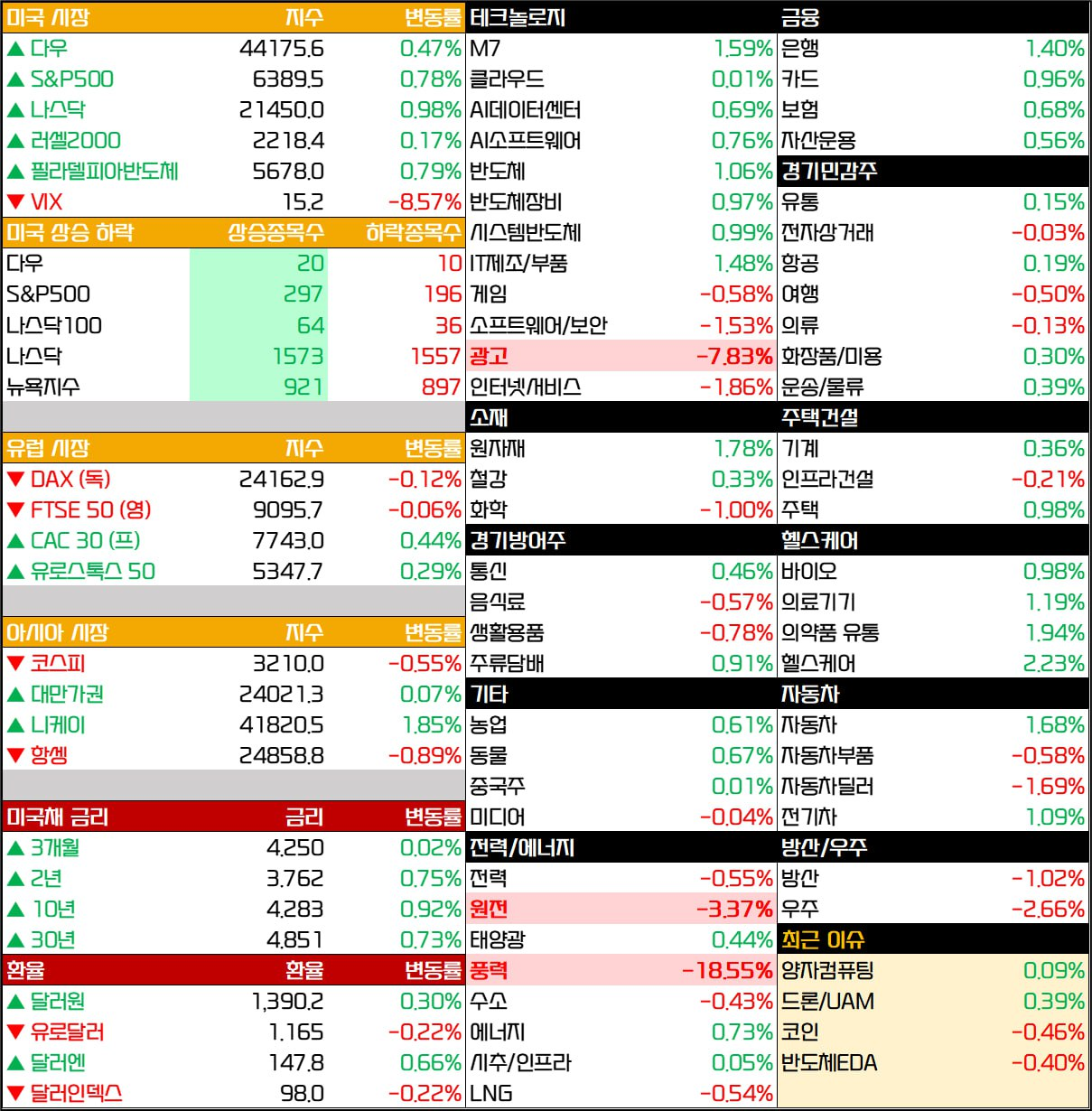 - 마이크론(+6.27%)은 트럼프의 반도체 칩 관세 부과 언급으로 불확실성 해소 기대, 신제품 기대, 씨티 등 많은 투자회사들이 최근 긍정적인 평가를 한 점도 긍정적인 요인.